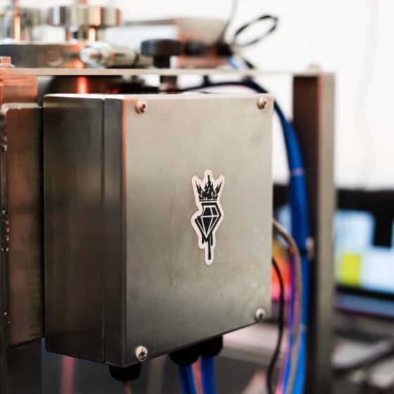 A typical Production run of live resin diamonds using a butane hydrocarbon extraction method consists of; a starting batch of material at cold temperatures for THCA extraction to reduce the chances of dilutants to the mother liquors THCA to solvent ratio which is the main factor to the chemical process of creating diamonds. Once the extractor has started the agitation of the collection separation column and the mother liquor is collecting in the lower vessel. By intentionally removing the collection vessel from the extractor with a higher level of solvent is critical to the process. The extractor will then pour that solvent/liquor solution into the miner vessel, cap the vessel with the Crown Miner Cap and check for seal leaks from the vessel with a handheld hydrocarbon monitor. The vessel can then be approved to be removed from the hazardous area and immediately attached to the miner controller and ventilation pipework. Once the vessel is connected to the controller the user will move their operation over to the PC and Device Manager Software program. Within the program a user will already be connected to the controller via the device selector area of the software and then engage the vessel they have just connected to the software. A user will then be presented with a graph and real-time readings of the parameters of the sensors and vessel auxiliary devices. The individual vessel can have individual setting for data logging, temperature control and ventilation routine. These settings are expandable and incorporate a ramping function to have a temperature routine running for the vessel. Custom routines outside of the standard scope of the software can also be customized for the individual user or facility at additional cost. The controller and software use ethernet or USB as forms of communications to the PC. It can be integrated into an existing network of a facility allowing the pc to be located remotely away from personnel to only be touched once the vessel is ready to be harvested by a manager. The controller will continue to operate with all the settings and parameters set by the software if the connection was ever lost. All the data can be set to log in a specific location on a server or network location. In addition, it has features like roll reports and template reports that will auto generate into printable documents for compliance and trackability within a facility or integration into an existing tracing or metrics program. The Crown miner system can be customized in both standard and more sophisticated arrangements and are great to integrate into existing productions. The vessels can be replaced with existing vessels from the extractor manufacturers as the collection vessel on the extractor can act as the same vessel as the miner vessel allowing for an easy and streamlined process. They can also be upgraded over time by replacing heated circulators with refrigerated circulators to increase the operational temperature range for the vessel. Additionally, the controllers can connect to up 2 vessels with the software license able to connect to 4 controllers making a total of 8 vessels per software license. Systems can be designed for these larger arrangements on individual customer or facility bases. The Crown Miner Smart Vessel is an intelligent product that is designed to increase production and safety capabilities for THC-A production as diamonds or sugars as well as a group of other products in the cannabis industry. The vessel is being used for more and more processes within laboratories and will allow a user to gain a better understanding of some of the post processing variables that effect the repeatable production for a facility.