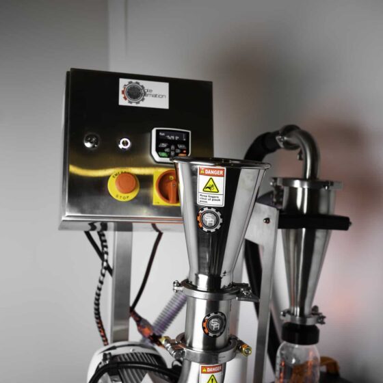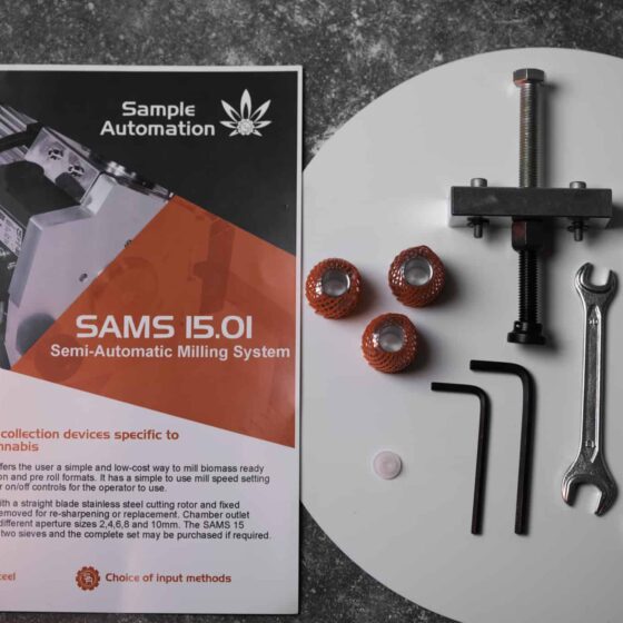 Introducing the SAMS.15 Semi-Automated Cutting Mill by Sample Automation. The newest product in our suite of cannabis equipment solutions, this Pharmaceutical-grade cutting mill enables manufacturers to standardize and scale their flower throughput to meet the ever-evolving production demands of the industry. The traditional weed-whacker style grinder limits operators output and quality by creating unwanted friction and heat and in turn, dramatically degrading the terpenes and trichomes of the flower. Sample Automation incorporates a negative pressure vacuum paired with a cyclone separator to create “no heat” technology. This was meticulously crafted to preserve and maintain the flowers highest terpene and trichome levels, which are essential to the quality and flavor profile of the end-product. The SAMS.15 Miller, allows manufacturers to customize your output material based on three variable elements: the grinding screen size, blade width and rotor blade speed.